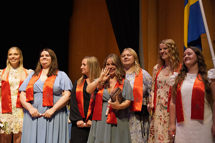 The spirits were high during HHJ's graduation ceremony in Pingstkyrkan. There was mingling, beautiful music, the awarding of scholarships, the Pedagogical Prize as well as speeches by Eleonor Fransson, Acting Dean at HHJ, and Gustav Sandberg, chair of the student association Hälsosektionen. The students went up on stage, programme by programme, to receive the cheers of the packed church.