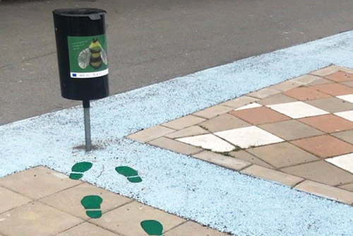Eleverna i årskurs 4 på Rosenlundsskolantog tog i maj 2021, tillsammans med Marlene Svensson, avfallspedagog från June Avfall & Miljö, fram klisterlappar som placerades på skolans papperskorgar. I juni målade man också gröna fotspår som leder till papperskorgarna.
