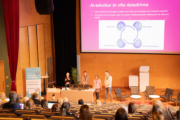 Sist ut på konferensen var ett panelsamtal där Olle Häggström, Linnéa Stenliden, Ylva Lindberg, Andrew Galbraith och Joel Rangsjö svarade på frågor från konferensdeltagare och diskuterade möjligheter och ansvar med AI inom skolans värld.