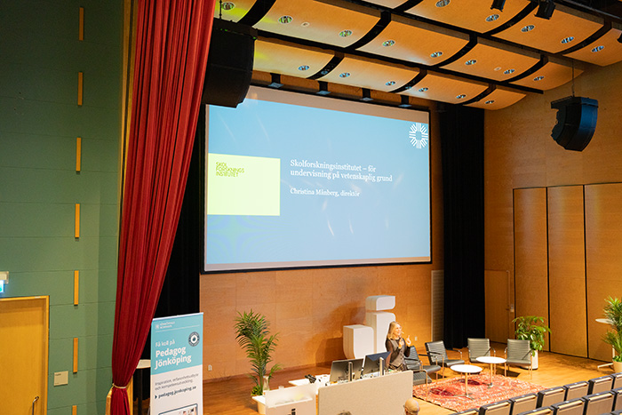 Christina Månberg, direktör för Skolforskningsinstitutet, berättade sedan om hur de hjälper till att arbeta för att undervisningen i förskolan och skolan ska bedrivs på vetenskapliga grunder och hur de sammanställer olika forskningsresultat.